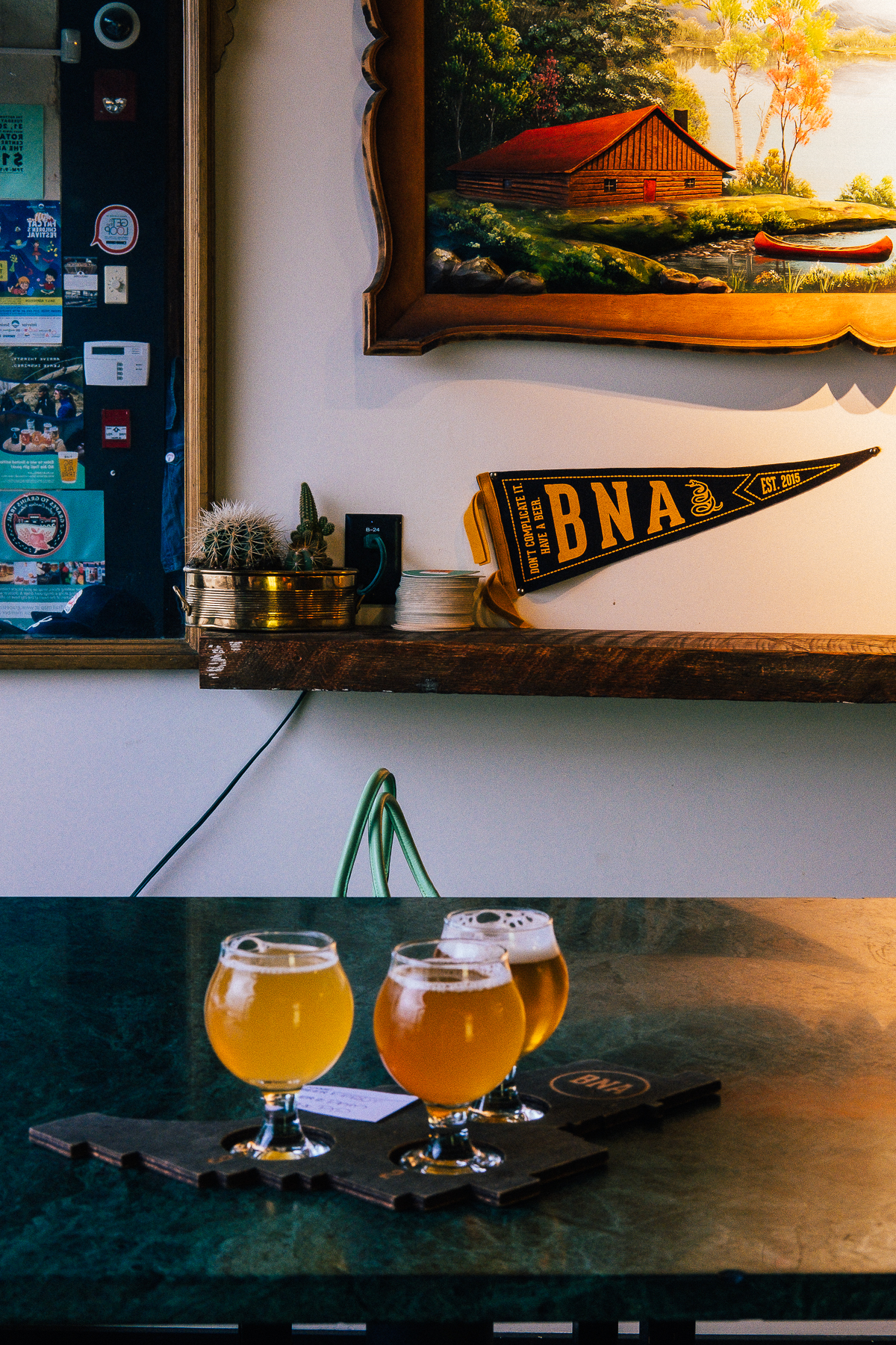 BNA’s Tasting Room is where we started our evening, sampling some of their beers before dinner. It’s a cozy little room, with some vintage decor and you can sit outside too. Tasting Flights, Sleeves, and Growler Fills are available.