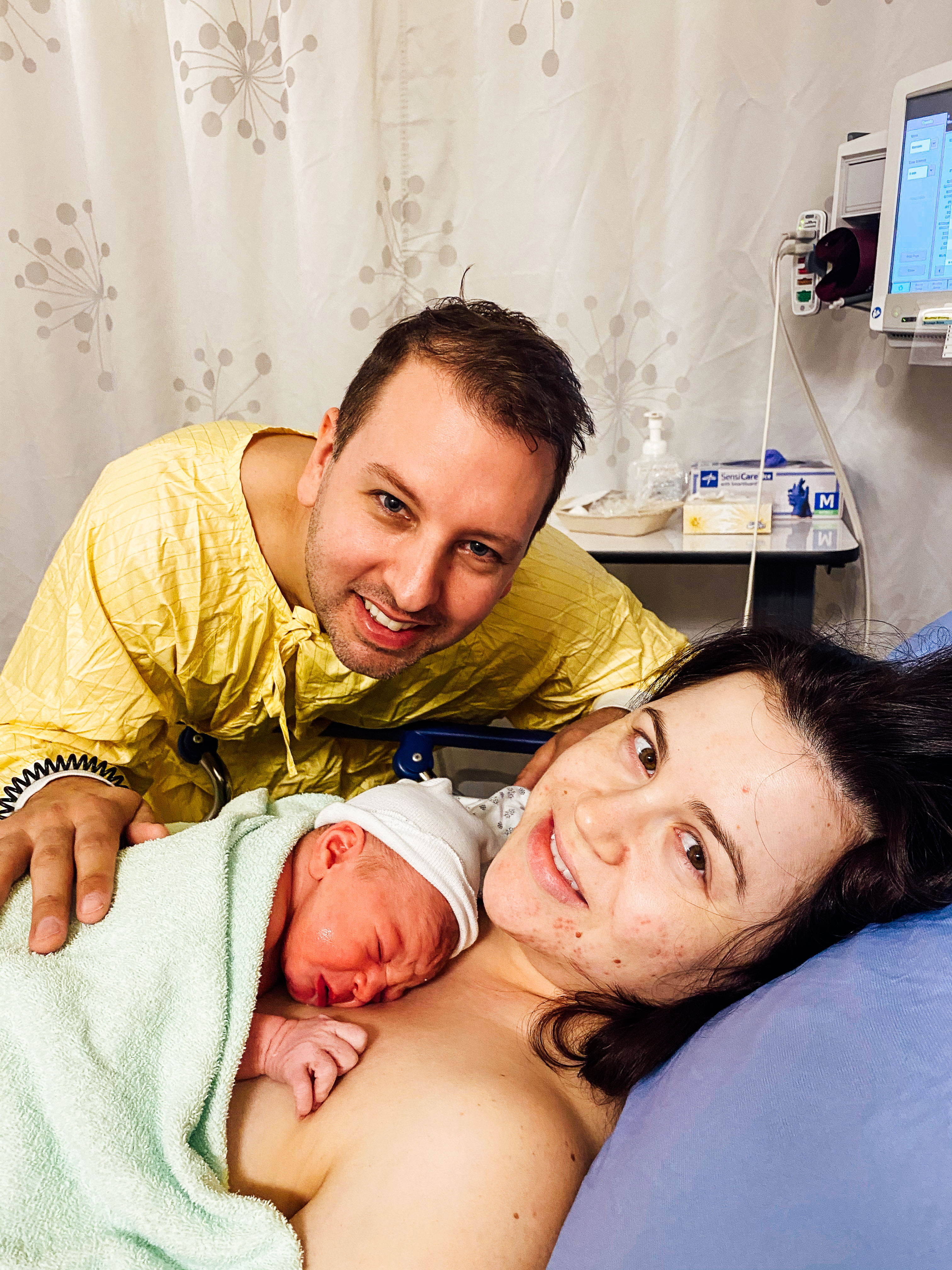 After a couple of hours with contractions, and 12 hours at the hospital after being admitted, I opted for an epidural to get some much-needed sleep. They kept telling me to consider it because I could be in that early labour for a few more hours, which was not even active labour and I was like oh shit. So I got the epidural and let me tell you, going through contractions while being told to not move an inch was tough. Thankful Curtis was there to guide me and remind me to just breathe through them. In my original birth plan (which was very, very loose) I put down I wanted the laughing gas before considering an epidural but because of the pandemic that wasn’t an option anymore.