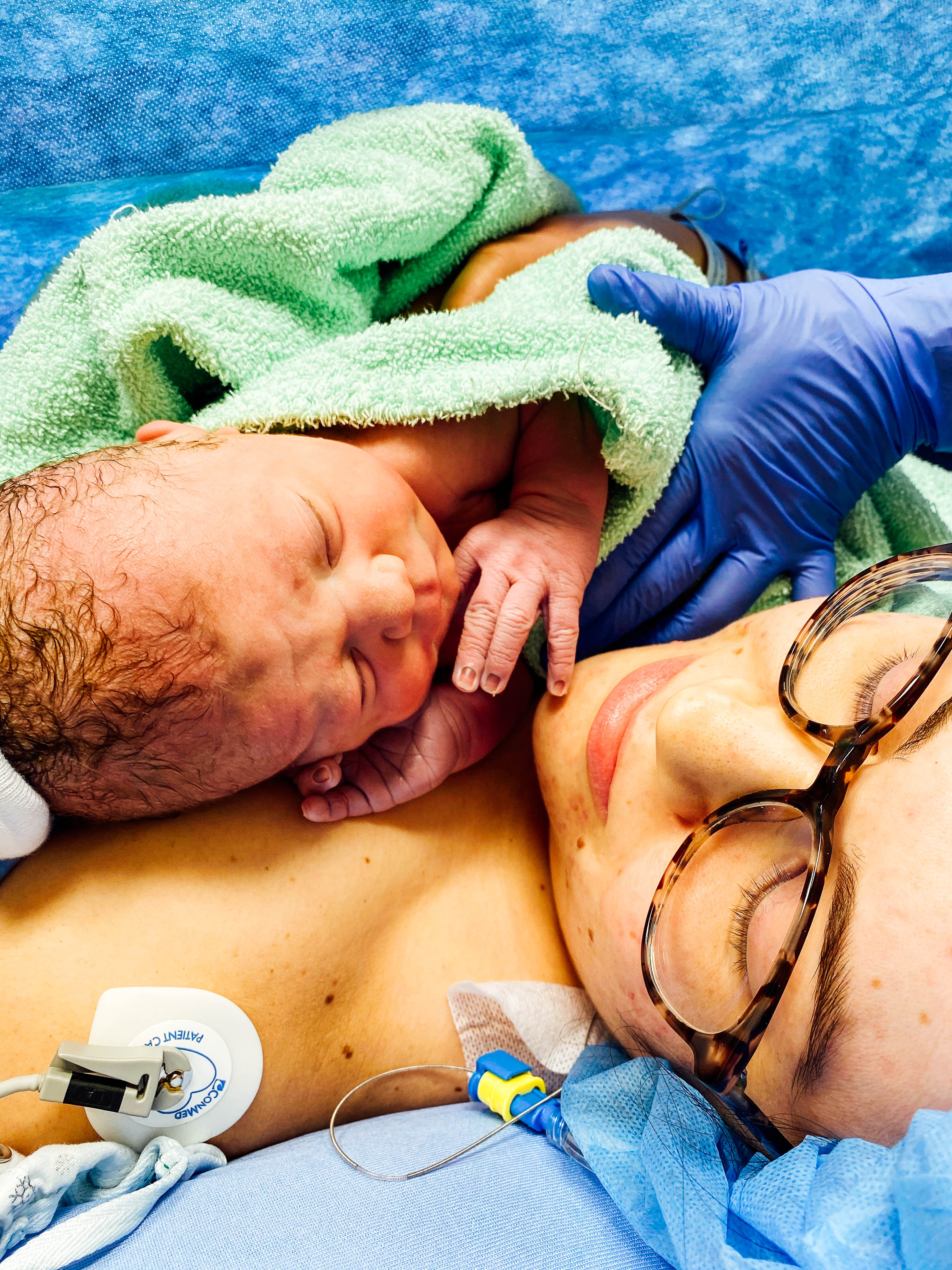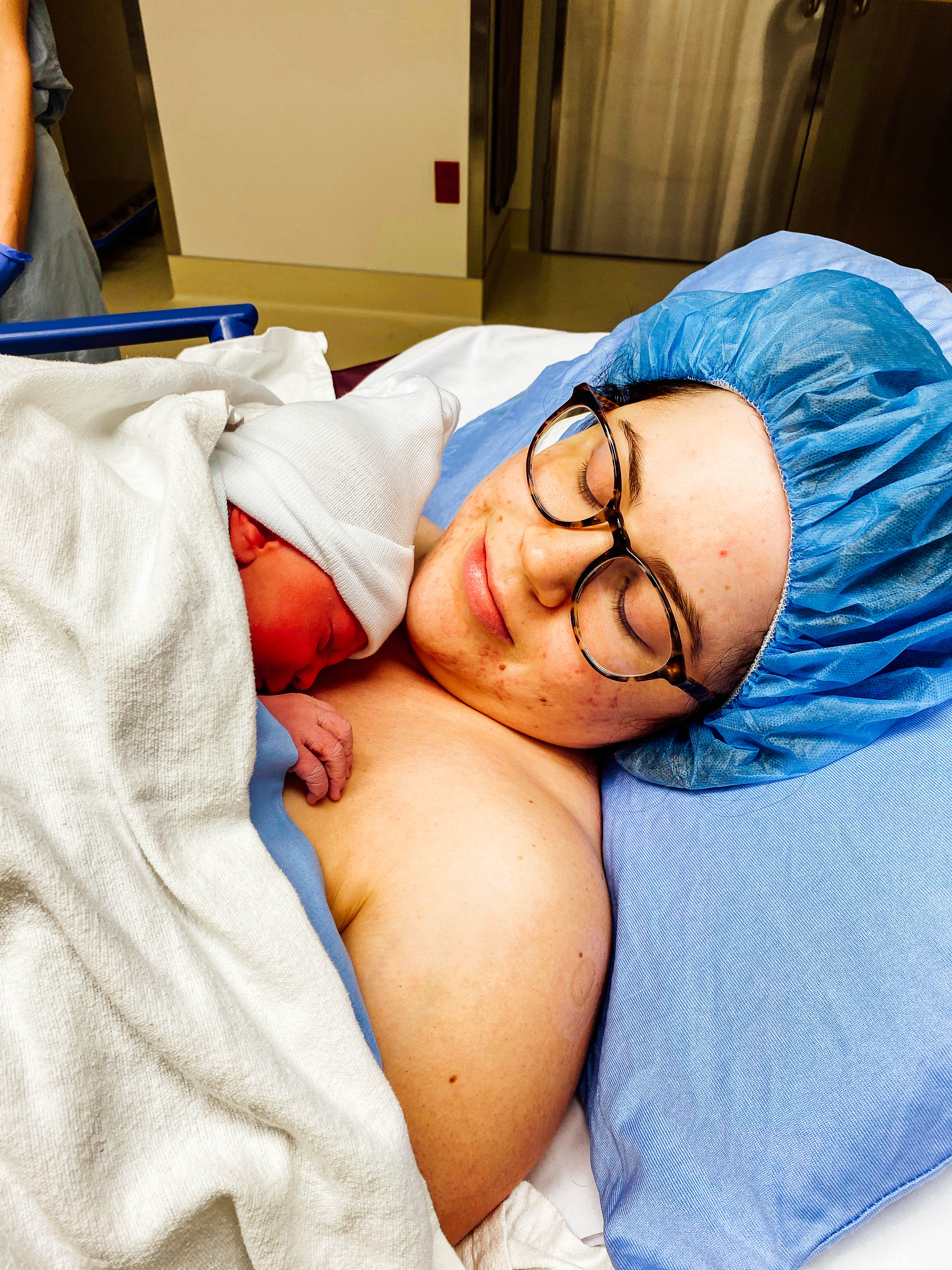 30 minutes later I was in the OR, my midwife was there offering comforting words and was shocked at how calm I was and I just said I didn’t have a choice, this was the best one. Curtis then entered and kept telling me I was doing amazing and how much he loved me and how excited he was to meet our baby. By the way, we didn’t know what gender she was going to be. I swear it felt like 2 minutes and she was pulled out and I heard Curtis exclaim it was a girl and cried. I’m not going to lie, I felt out of it being on anesthesia and felt emotional but also didn’t at the same time. They plopped her on my chest and we did a little skin to skin before she was quickly whisked off to be checked and they finished sowing me up. I had to be moved around and cleaned up so she couldn’t stay on my chest the whole time thankfully Curtis was with her and once we were in post-op she was immediately placed back on my chest. He said she came out sucking her thumb haha wish I could have seen it. Meeting her for the first time was overwhelming and shocking that she was just in my belly moments ago. Also, how did she manage to fit in there??