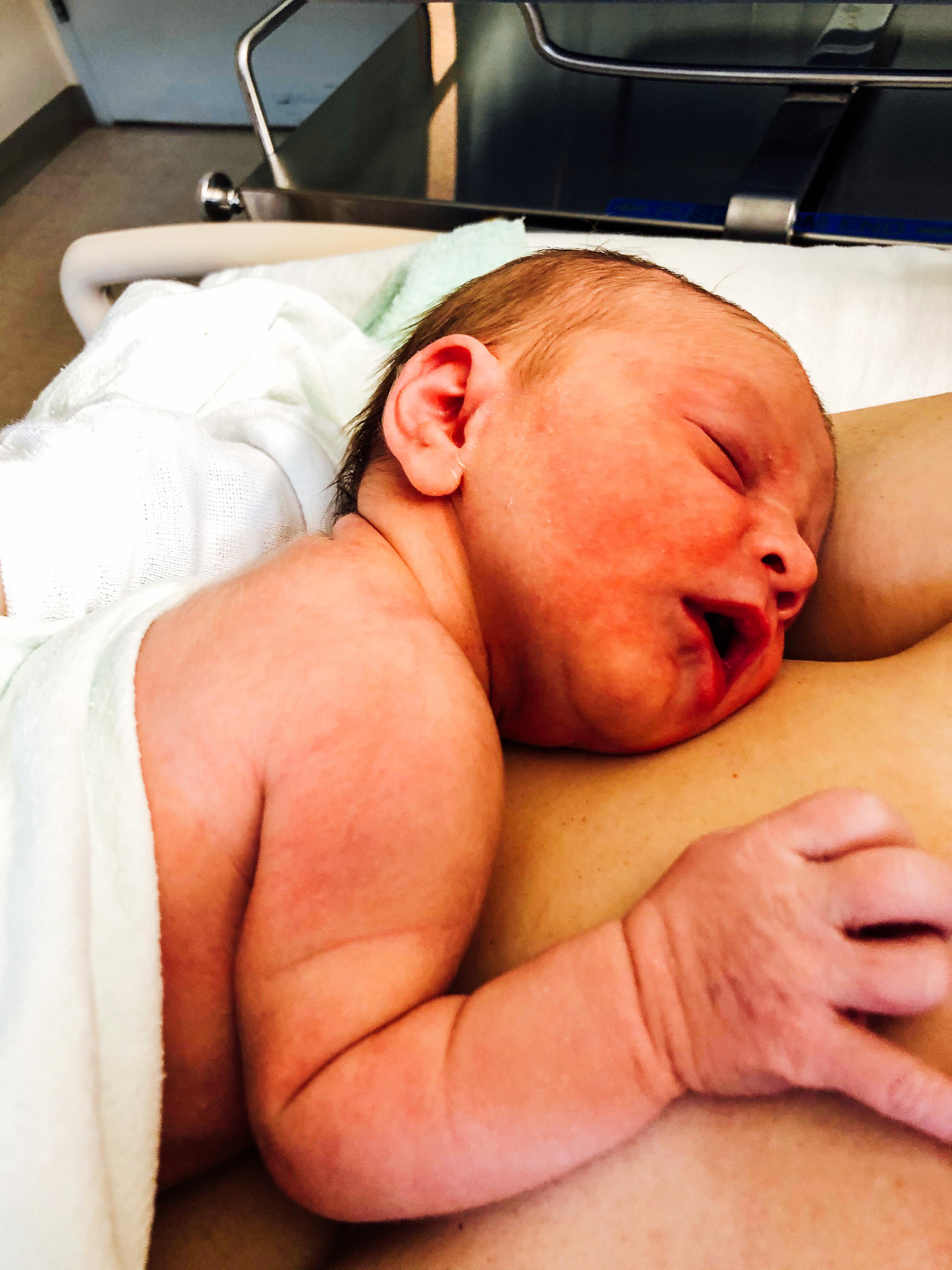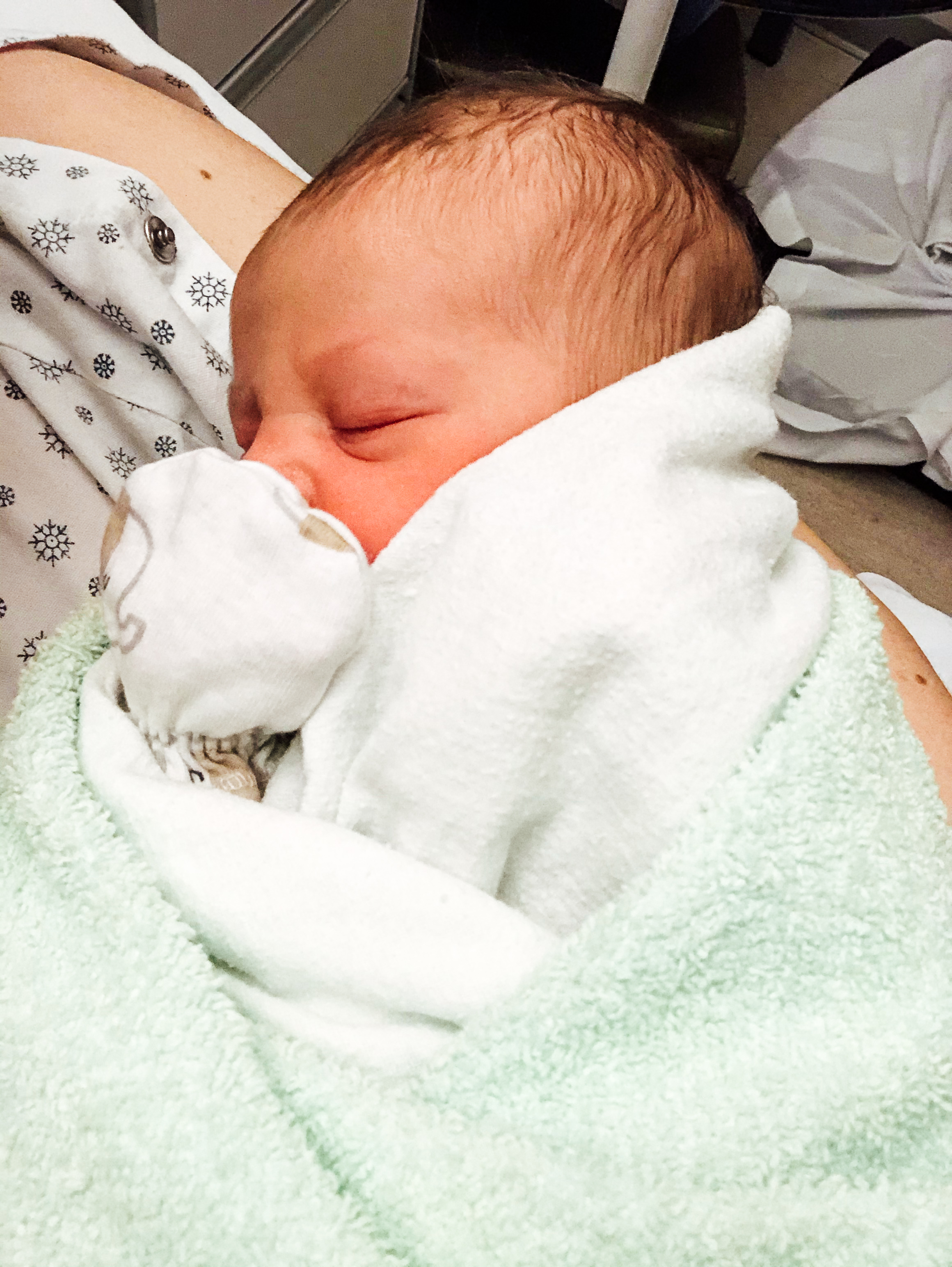The anesthesiologist topped me up before the surgery, so apparently I had a higher dosage and it took all day for the shakes and numbness to wear off. Curtis and I ended up sharing skin to skin all morning because at some points I was shaking so badly. Looking back, that was probably something we would have done anyway and continue to do so at home. It’s nice for them to also have that bonding moment. There was the problem that I couldn’t hold down food till later that night, and it was only crackers and granola bars because I threw up all my lunch and couldn’t even get out of bed without throwing up. AND they had construction and drilling going on the same floor as the post-birth rooms till 10 PM that night. I literally lost it, and we moved rooms to the other side where it was then muffled. Thank goodness because there was no way I was going to be able to sleep even though Rowan slept through it all like a champ.