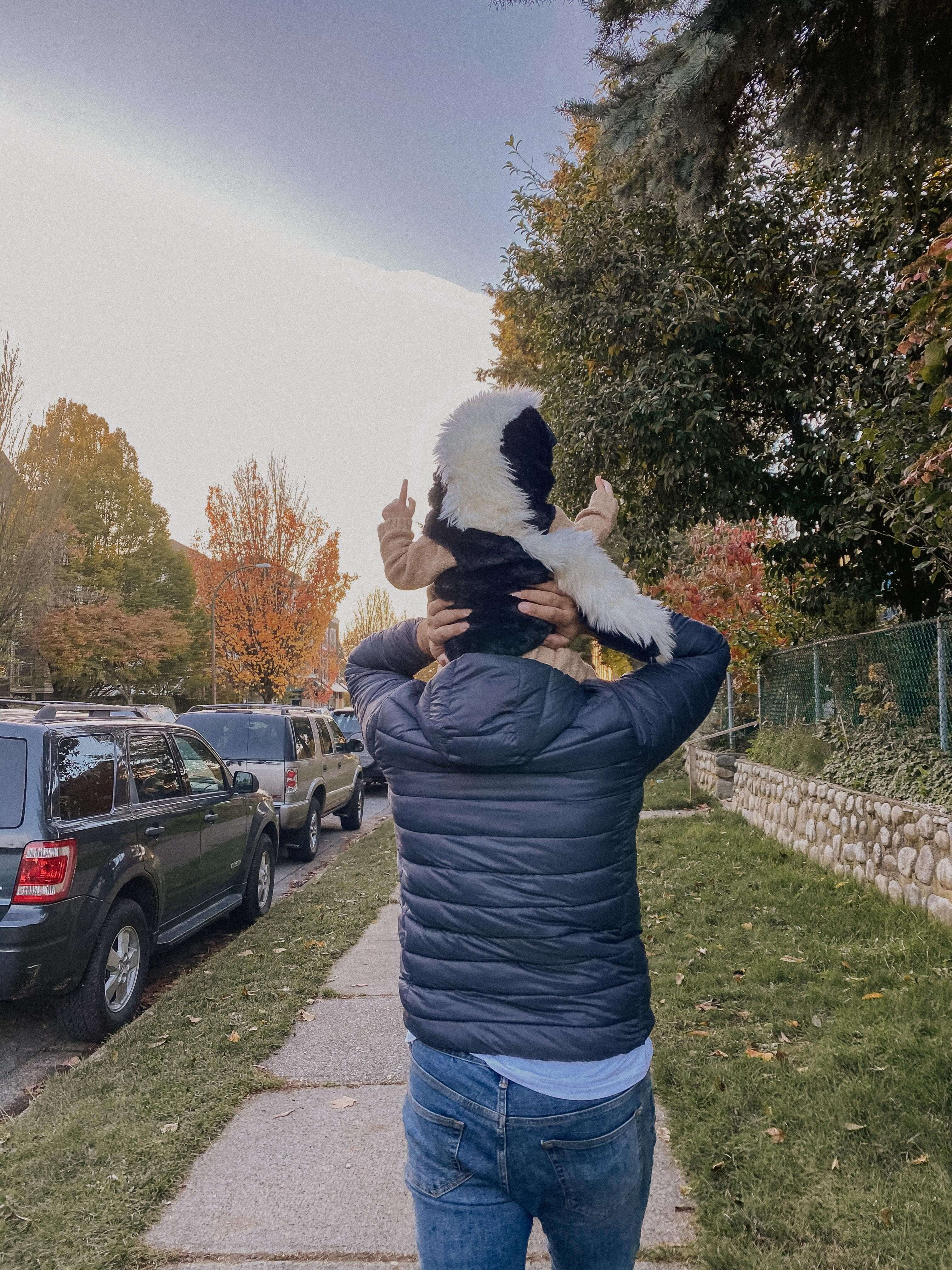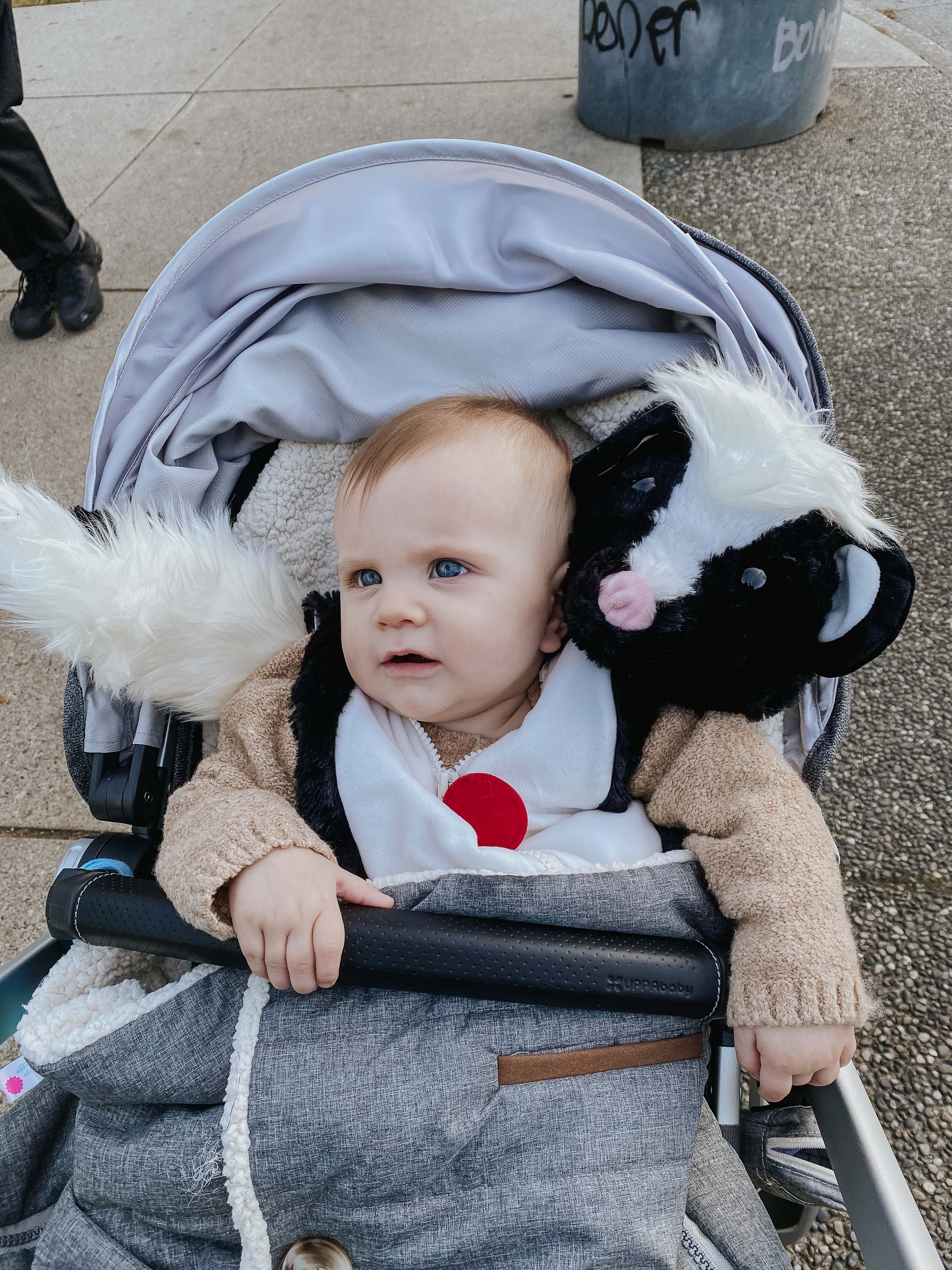 The first costume was a skunk, it was so adorable! I dressed (this is a loose term) as Bambi, pretty much just bought deer felt antlers online. It did the trick.
