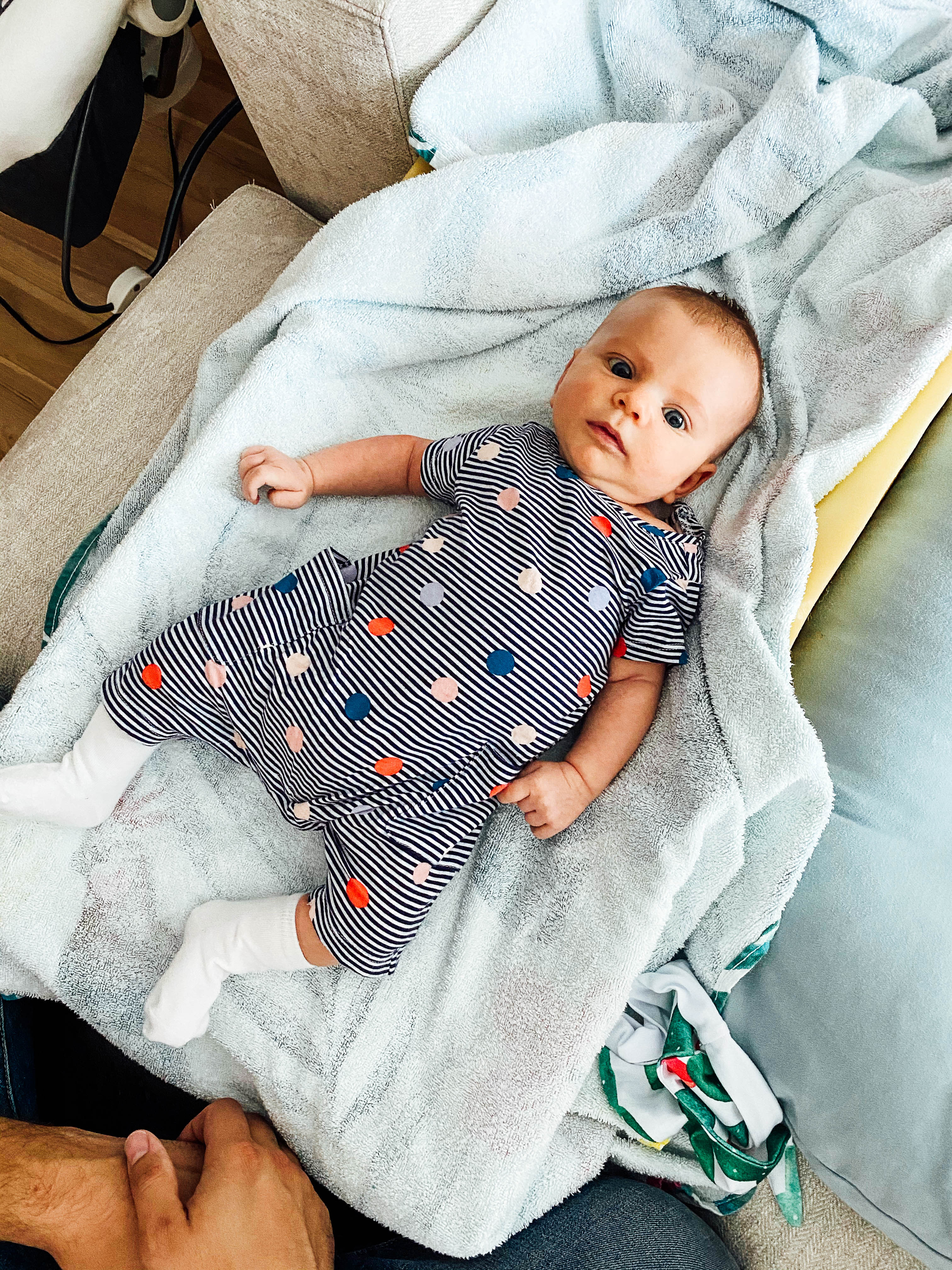 Sleep is going much more smoothly, around 6.5 weeks she started to sleep in 7-hour stretches during the night. We put her down around 9:30 PM and she’ll sleep till around 4:30-5 AM. Without waking up! It’s been amazing and I hope that continues till her dreaded sleep regression at 4 months. We started a routine in a way, on nights she gets bathed we dim all the lights, get her jammies on, give her a little bit of boob, sing lullabies or rock her while walking around the house and then she passes out. At first, we weren’t sure if she’d wake up in two hours so we would stay up anticipating that, and then she’d continue to sleep for hours. I now find myself pumping right after, and then crawling into bed around 11 PM.