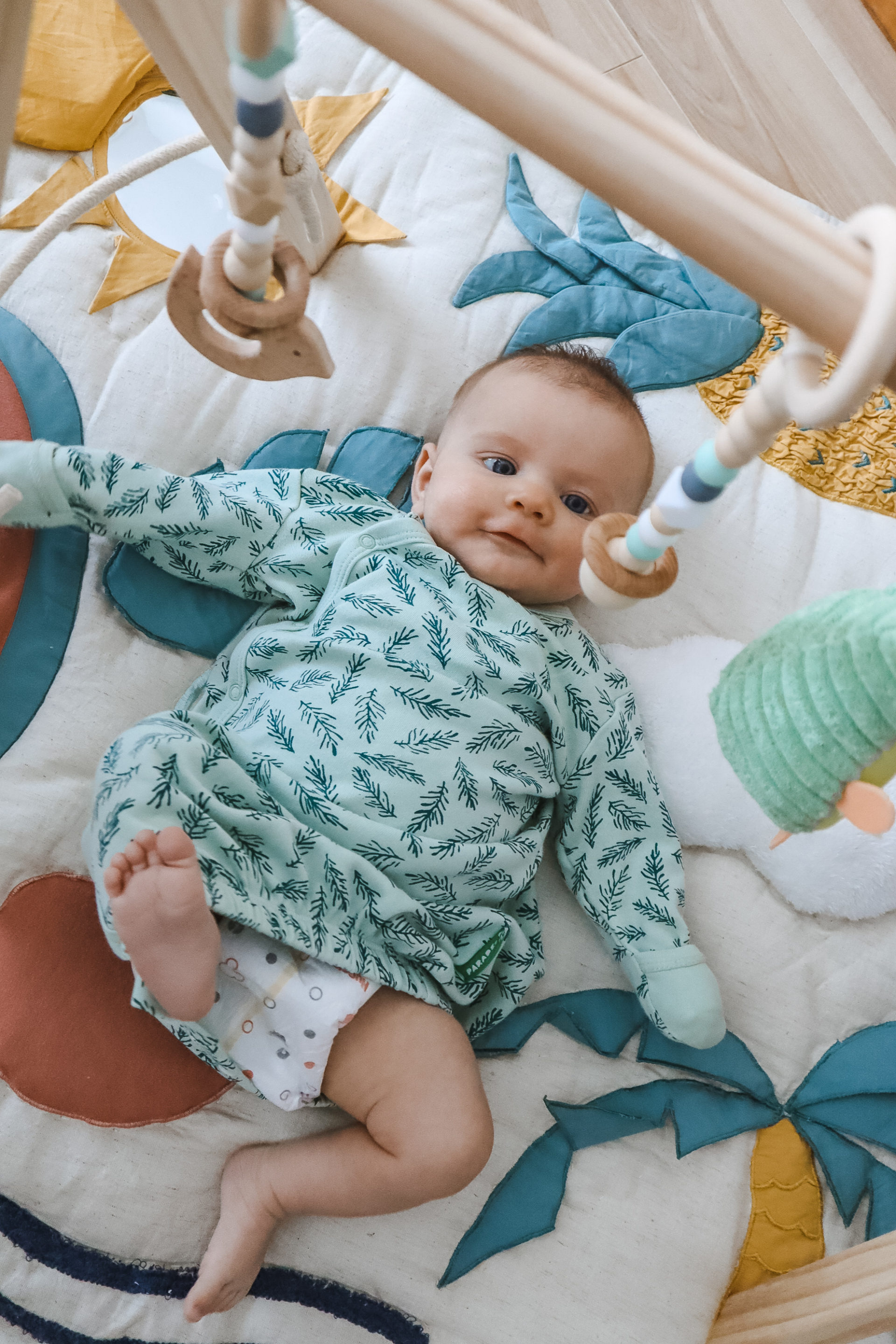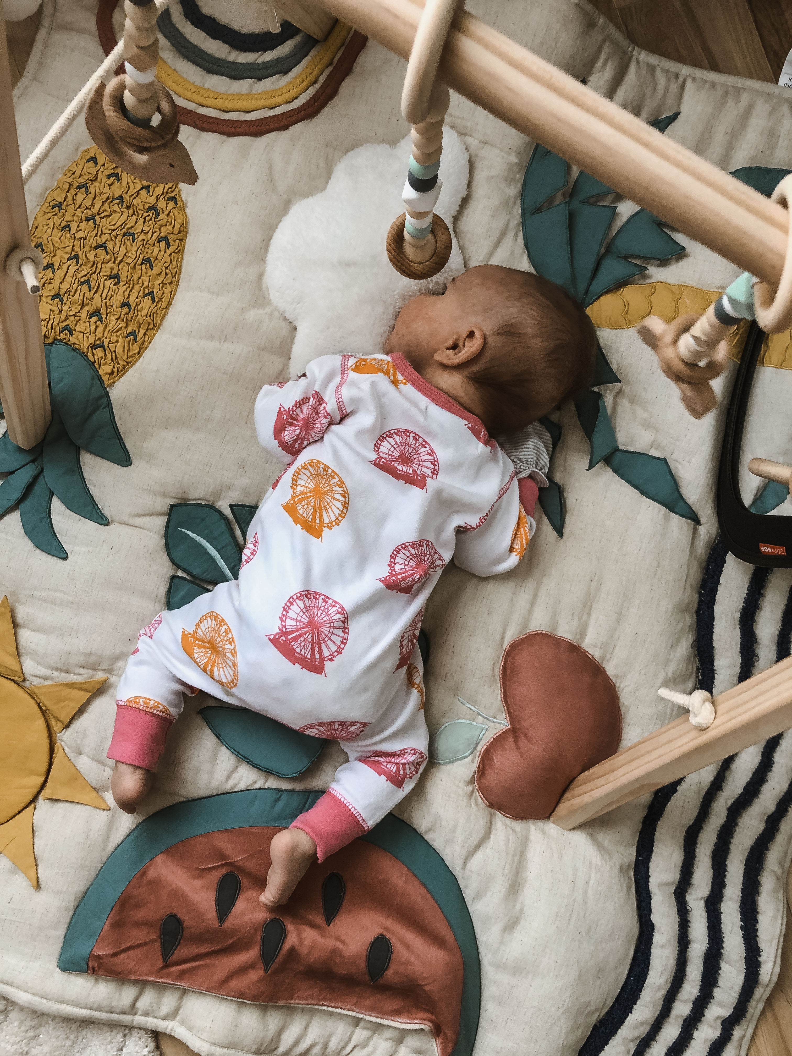 I set up her playmat and gym in her room but also bring it into our living space so she can have more opportunities to practice her motoring skills and swatting at the toys dangling from the play gym. Tummy time is going great, she can now lift her head and rotate it side to side, less jerky too!