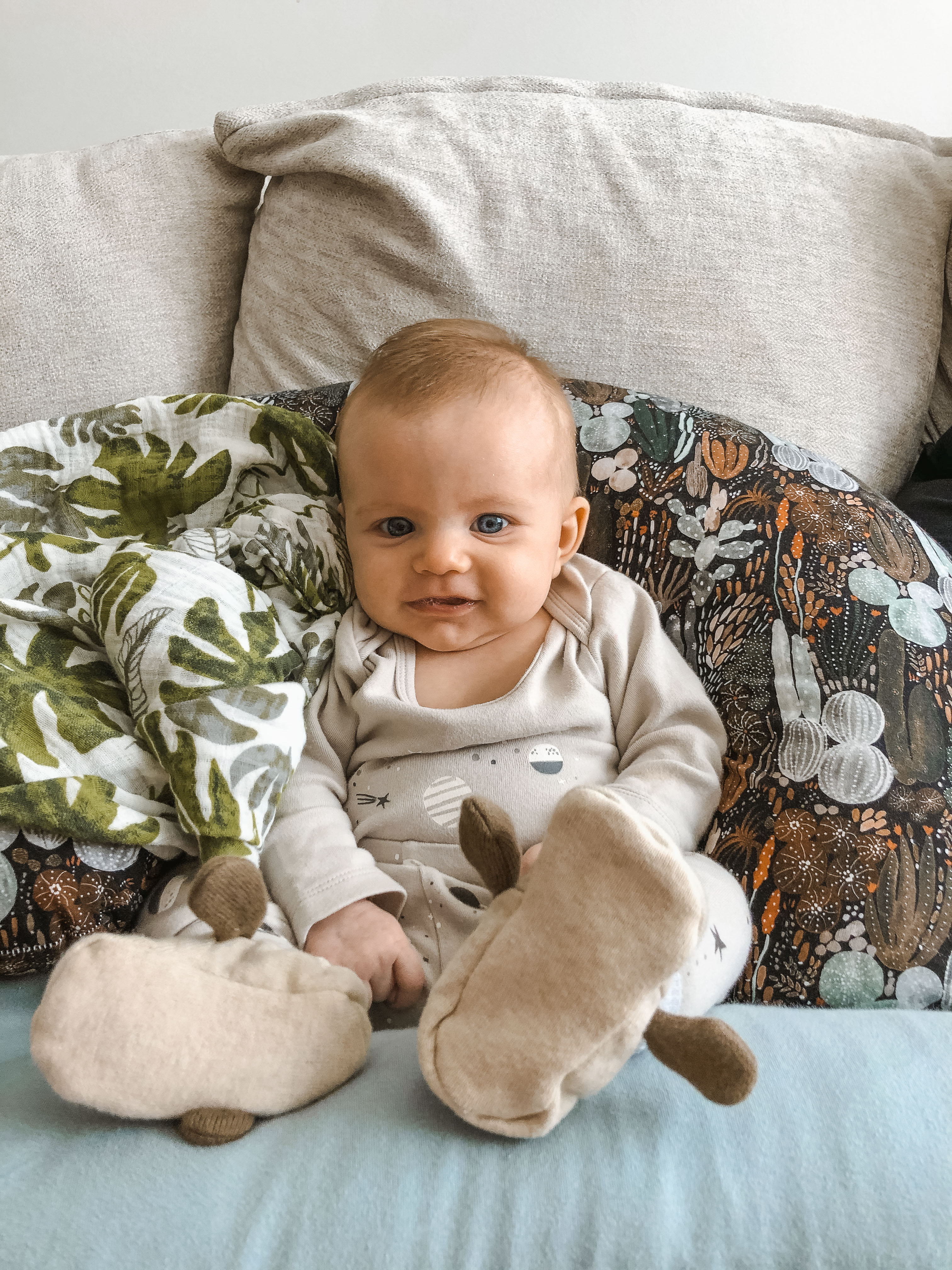 She did her first roll a week ago, and then two more followed right after. Since then, she tries to roll every day, some days she’s successful, some days not. And she really tries to crawl, grabs her blanket on the floor, and really tries to pull herself forward. Curtis also bought her a bumbo seat and she can sit up in it now, loves to whack at her toys on the play gym from it haha.