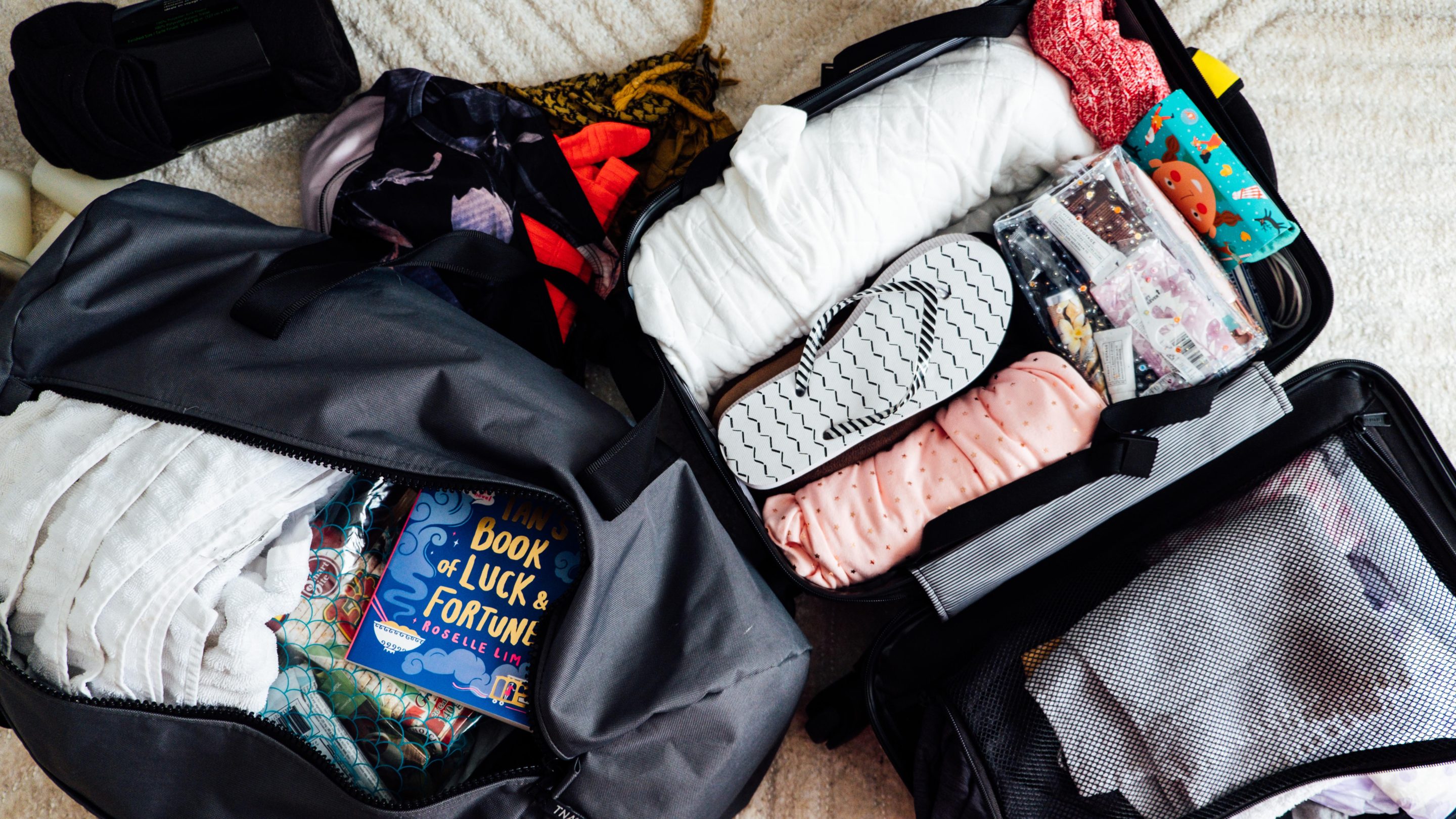An iPad with a couple of movies downloaded on it, a camera, a small tripod, a book, and magazines are all in the bag as well. Just in case we are there for a day or two afterward. Oh, and I also put in an extra-long phone charger because you never know where the extra outlets are in the room.